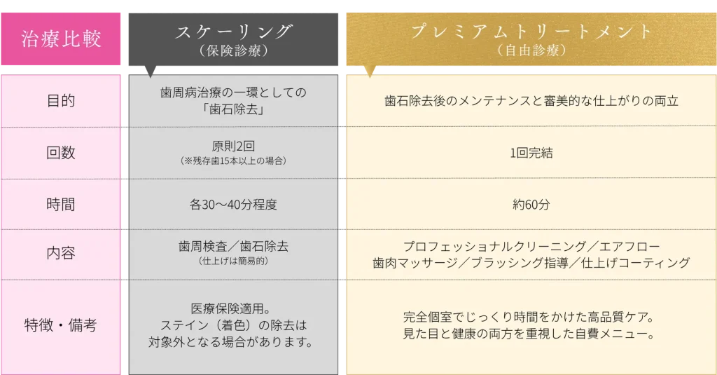 プレミアムトリートメントは、定期検診や保険診療での歯石除去を終えた方に向けた、ワンランク上のメンテナンスプランです。